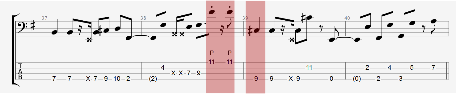 As you can see in the example on the right side, two plucks appear one after the other. This pattern is often used in the song. The best way to approach these two notes is by means of a double pluck. The strings are „popped“: The first pop is played with the index, the second pop with the middle finger.